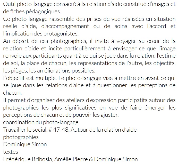 [n° ou bulletin] est un bulletin de Travailler le social HS 5 - image & relation d’aide : outils d’ateliers participatifs [Livres, articles, périodiques] . - 2015. Langues : Français (fre)