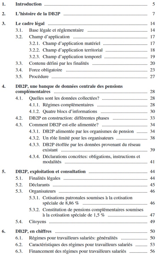 DB2P, une banque de données des pensions complémentaires du deuxième pilier [Livres, articles, périodiques] / Steven Janssen, Auteur ; Sofie Palmans, Auteur . - Waterloo : Wolters Kluwer, 2014 . - 60 p.. - ( Life & Benefits; 02) . ISBN : 978-90-465-6376-2 Voir aussi la revue "Life & Benefits" en ligne sur les ordinateurs du Campus Guillemins Langues : Français ( fre) | Mots-clés : | Banque de données pensions complémentaires -- Fonctionnement | | Index. décimale : | 368.9 Assurance concernant les personnes | | Résumé : | A une époque caractérisée par le vieillissement de la population, la mobilité des travailleurs et l’incertitude quant à l’avenir des pensions, il est apparu que les citoyens avaient droit à des informations globales sur leurs pensions. La banque de données du deuxième pilier de pension sera un instrument primordial pour informer mais aussi pour orienter les comportements. La banque de données "constitution de pensions complémentaires", créée en 2006, est un chantier en cours qui ne s’achèvera que prochainement. Il faudra attendre 2016 avant que sa dernière composante ne soit opérationnelle et que le dernier module de données n’y soit ajouté.