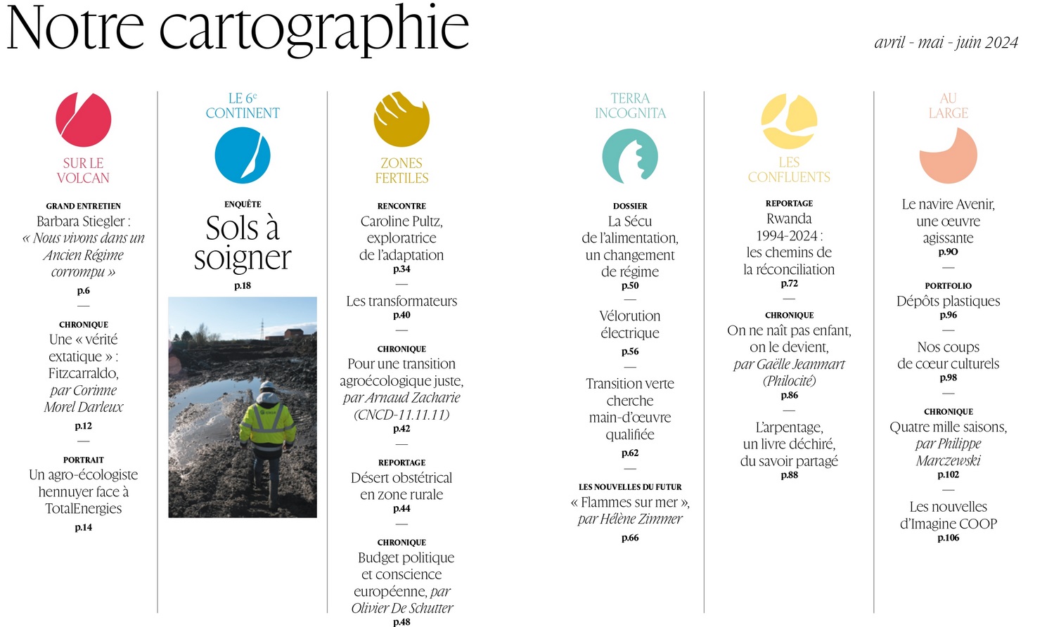 [n° ou bulletin] est un bulletin de / André Ruwet160 - printemps 2024 - Enquête. Sous nos pieds, des sols à soigner [Livres, articles, périodiques] . - 2024 . - 104p. Langues : Français ( fre) | Mots-clés : | Vélo électrique Rwanda Démocratie Transition verte Agroécologie Agro-écologistes Néolibéralisem Extrême droite Dangers Risques Fondements Régimes autoritaires Assemblées citoyennes Assemblées délibérantes France Belgique Agriculture Jurisprudence Dérèglement climatique TotalEnergie Terre Sols Justice Europe Multinationales Union européenne U.E. Dépollution | | Résumé : | Accompagnez-nous dans le désert avec Caroline Pultz, exploratrice low-tech, dans la ferme de Hugues Falys, David qui porte plainte contre TotalEnergies-Goliath, à la recherche des sages-femmes et gynécologues dans les déserts obstétricaux, ou dans une séance de lecture collective grâce à l’arpentage. Découvrez le projet salvateur du navire Avenir, conçu pour recueillir les exilés naufragés ; celui, ambitieux, du collectif pour une Sécurité sociale de l’alimentation ; ou encore le gigantesque travail de réconciliation dans un pays traumatisé, le Rwanda. Apprenez-en plus sur la vélorution en cours et la transition écologique en mal de main-d'œuvre. Et explorez la démocratie avec Barbara. | | Note de contenu : | Rwanda 1994-2024, sur les chemins de la réconciliation